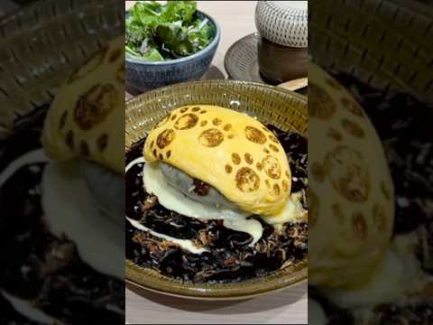 目の前の鉄板で焼くハンバーグとオムレツを乗せたハンバーグオムライスが人気のお店✨今回注文したのはハンバーグオムライス 黒カレー +チーズトッピング(2200円)